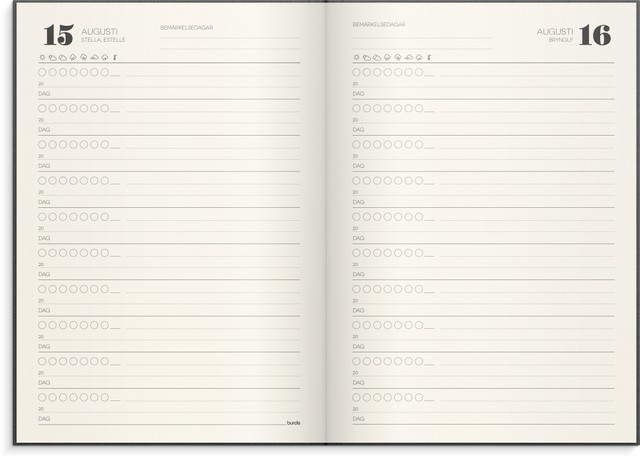 Mått: 211 x 146 x 29 mm. Layout: Dag/sida. Omslag: Linnetextil. Inbunden. Detaljer: Märkband. Innehåll: Namnsdagsregister, årsplan. Antal sidor: 384. Pappersvikt: 100 g. Miljöinformation: FSC® papper. Varumärke: Burde.