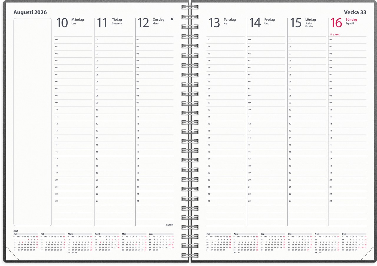 Format: A5. Mått: 215 x 163 x 16 mm. Layout: Vecka/uppslag. Stående. Timindelning 00-23. Kalendarium: 2025-12-08 – 2027-01-03. Omslag: Återvunnen kartong. Spiralbunden. Innehåll: Kyrkliga helgdagar, flaggdagar, helgdagar/aftnar, månfaser, namnsdagar, internationella helgdagar översikt, temadagar/händelser, årsöversikt/årsöversikter, årsplan/årsplaner. Antal sidor: 160. Miljöinformation: FSC®.