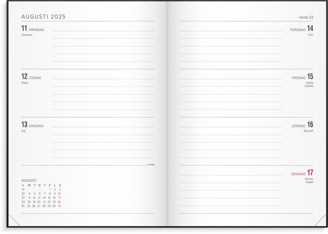 Kommer även i ett mindre A6 format. Omslaget Vega i svart skinnimitation ger en klassisk look till en traditionell kalender.