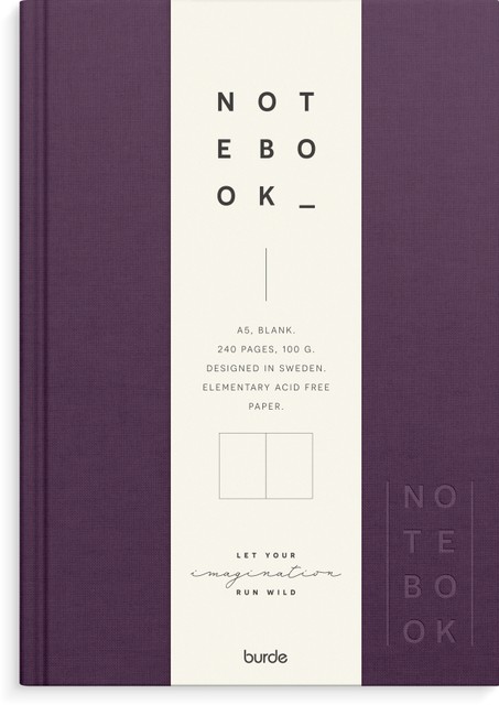 Format: A5. Mått: 216 x 152 x 20 mm. Layout: Olinjerad. Omslag: Linnetextil. Inbunden. Detaljer: Märkband. Antal sidor: 240. Pappersvikt: 100 g. Miljöinformation: FSC®. Varumärke: Burde.